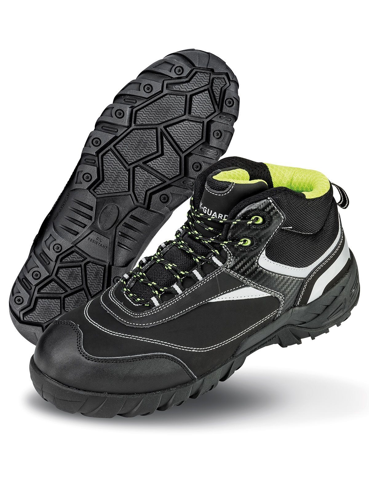 Parte superiore: 100% pelle nabuk, intersuola: 100% kevlar, suola: 100% EVA/gomma. Scarpe con puntale in acciaio, proprietà antiscivolo e antistatiche, dettagli riflettenti, caviglia e linguetta imbottita, calzatura solida e resistente. EN ISO 20345:2011 S3 SRC.